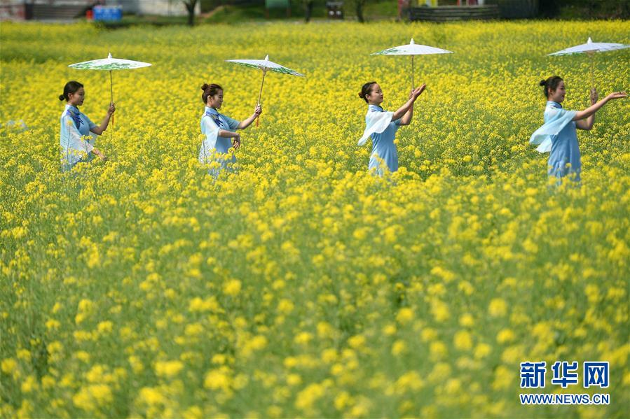 3月16日,演員在李坑村的油菜花田里表演。 新華社記者 萬(wàn)象 攝