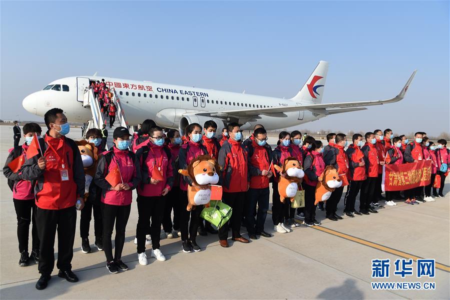 3月17日,醫(yī)療隊(duì)隊(duì)員抵達(dá)甘肅蘭州中川國(guó)際機(jī)場(chǎng)。新華社記者范培珅攝