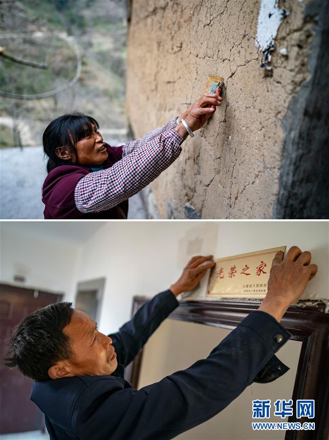 這是一張拼版照片:上圖為云南省永善縣大興鎮(zhèn)駱丘村村民王大香拆下老屋的門牌留作紀念(3月14日攝);下圖是作為現(xiàn)役軍人家屬的晏付高把“光榮之家”的牌匾掛在新家的門上(3月15日攝)。 新華社記者 江文耀 攝