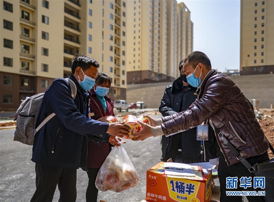 云南省永善縣大興鎮(zhèn)駱丘村村民晏付高(左一)和妻子王大香(左二)抵達(dá)魯?shù)榭h卯家灣,當(dāng)?shù)卣疄槊恳粦舻诌_(dá)的老百姓都準(zhǔn)備了當(dāng)日所需的生活用品(3月15日攝)。 新華社記者 江文耀 攝