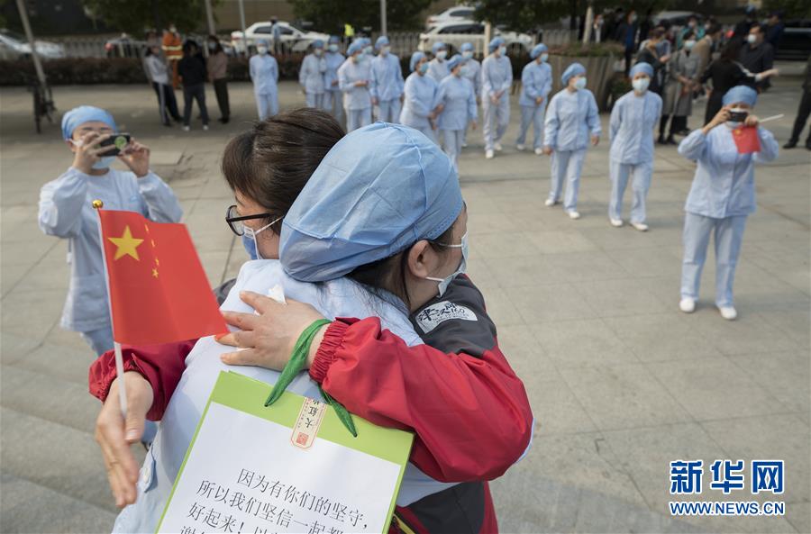 3月21日,武漢市第一醫(yī)院的醫(yī)護(hù)人員(前)與天津市醫(yī)療隊(duì)隊(duì)員李梅擁抱道別。新華社記者費(fèi)茂華攝