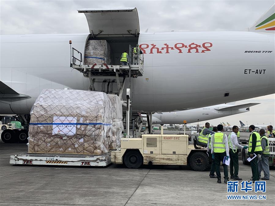 3月22日,在埃塞俄比亞首都亞的斯亞貝巴國際機(jī)場,工作人員將中國援助的抗疫物資運(yùn)下飛機(jī)。歷時(shí)10小時(shí)飛行,滿載著來自中國抗疫物資的埃航貨運(yùn)包機(jī)22日上午抵達(dá)埃塞俄比亞首都亞的斯亞貝巴的國際機(jī)場,這是馬云公益基金會和阿里巴巴公益基金會捐贈非洲的部分醫(yī)療物資,用于支援非洲54國抗擊疫情。新華社記者王守寶攝