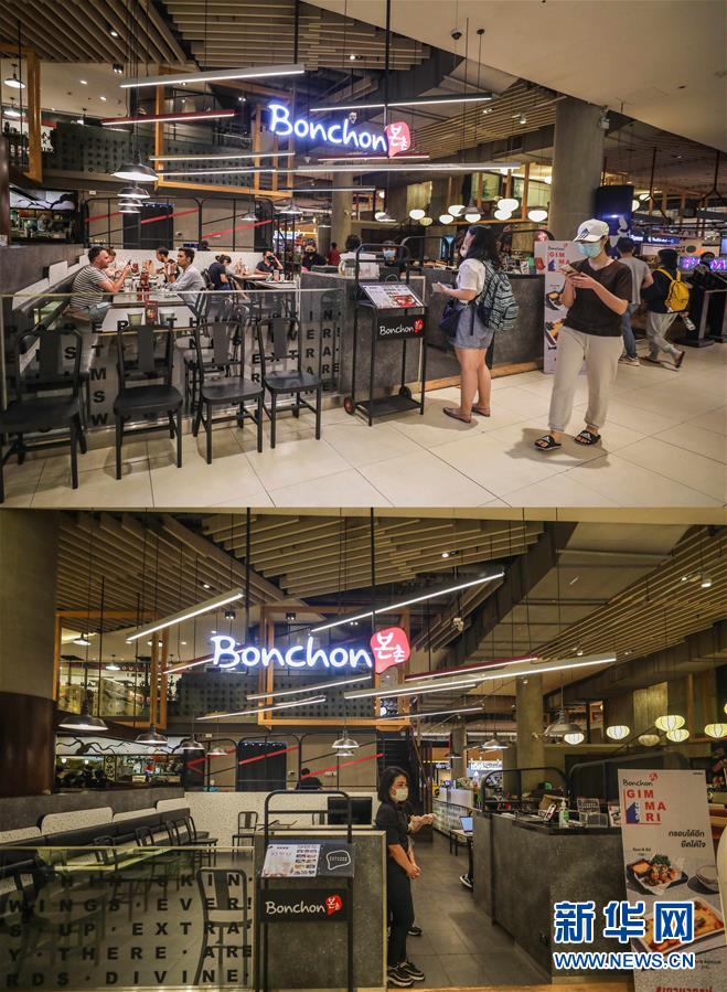 這是3月21日拍攝的泰國(guó)曼谷暹羅百麗宮商場(chǎng)負(fù)一層的美食城(上圖)和3月22日拍攝的美食城對(duì)比圖。商場(chǎng)除了負(fù)一層的美食城和超市外,全部關(guān)閉。美食城只對(duì)顧客提供外賣(mài)服務(wù)。新華社記者張可任攝