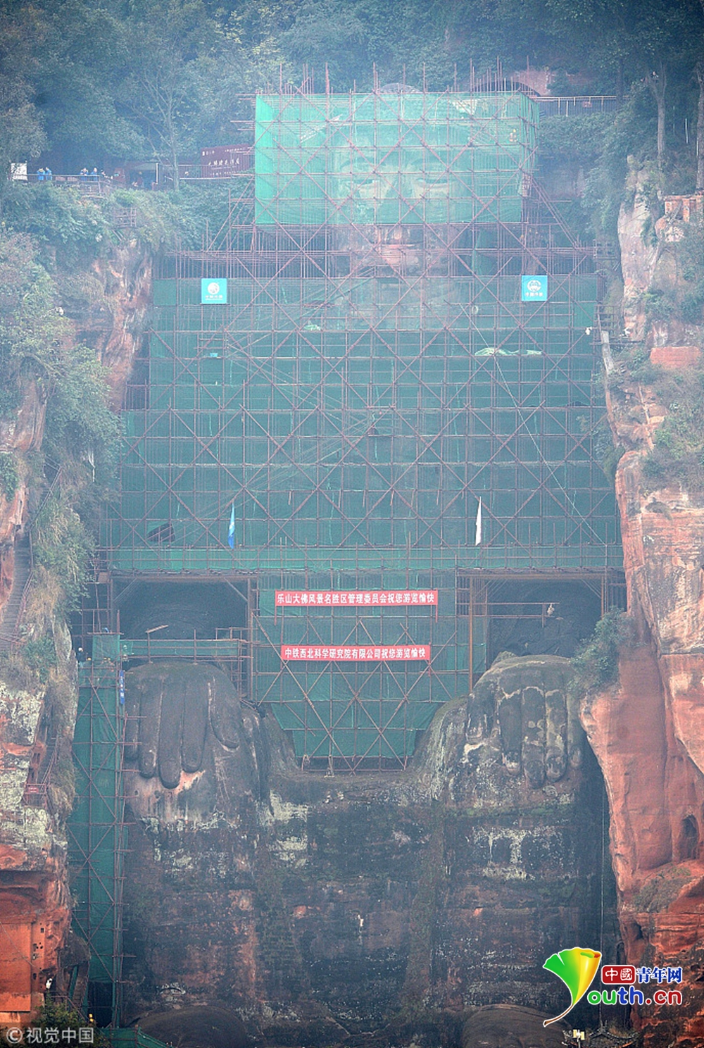 據(jù)大佛體檢項(xiàng)目負(fù)責(zé)人、中鐵西北科學(xué)研究院文保中心副主任孫博介紹說(shuō):主要是前期修繕材料出現(xiàn)耐久性問(wèn)題,造成胸腹部起鼓、開裂、剝落。因?yàn)榇蠓鹬黧w結(jié)構(gòu)從上到下整體是砂巖結(jié)構(gòu),但不同的砂巖層之間又有30厘米至50厘米厚的泥巖夾層,泥巖則相對(duì)較弱,那么泥巖夾層就變成了相對(duì)的隔水層。