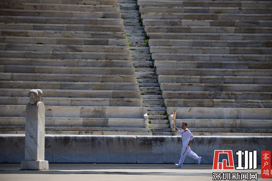 3月19日,最后一名火炬手里約奧運(yùn)會(huì)女子撐桿跳高冠軍、希臘運(yùn)動(dòng)員卡特琳娜·斯特凡尼季手持圣火火炬跑向終點(diǎn)。