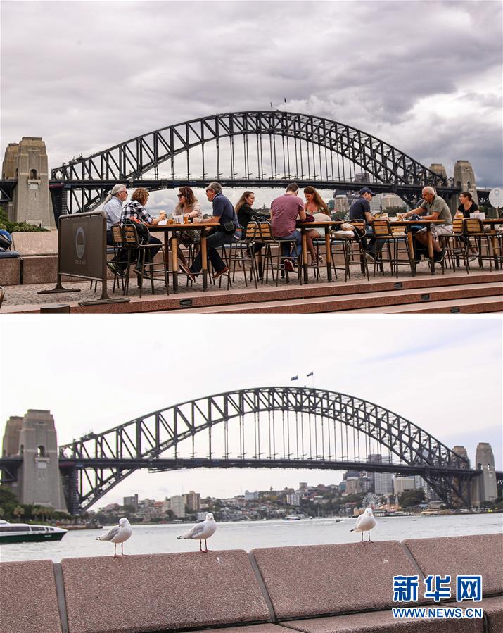 拼版照片顯示:(上)3月10日,人們?cè)诎拇罄麃喯つ岷8鄞髽蚋浇貌汀?(下)3月24日,澳大利亞悉尼海港大橋附近空無(wú)一人。 新華社記者 白雪飛 攝