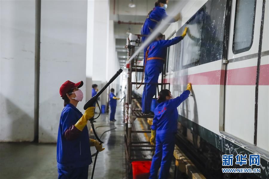 3月23日,在武漢地鐵常青車輛段,保潔人員在為地鐵列車消毒。新華社記者肖藝九攝