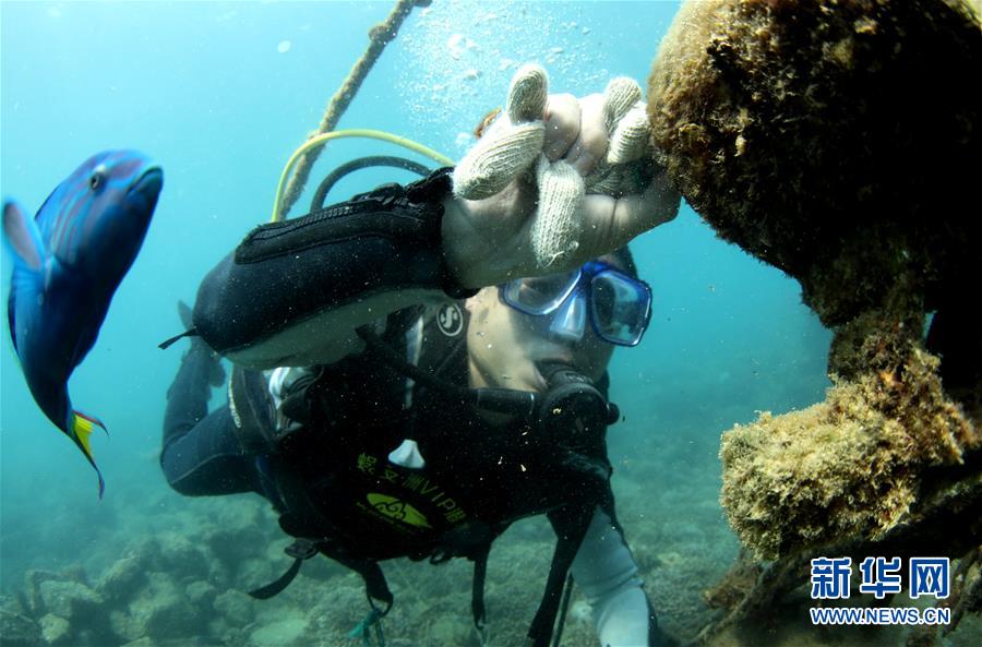 在位于海南三亞蜈支洲島旅游區(qū)的海洋牧場,工作人員在清理監(jiān)控設備(3月27日攝)。近日,位于海南三亞蜈支洲島旅游區(qū)的海洋牧場復工,海底作業(yè)逐漸恢復正常,開始進行人工魚礁吊裝擺位、水下監(jiān)控清理以及日常巡護等工作。據介紹,人工魚礁有利于魚類種類增加和數(shù)量提高,蜈支洲島海域海洋牧場人工魚礁表面附著珊瑚、貝類、藻類等生物種類達120余種。新華社記者楊冠宇攝