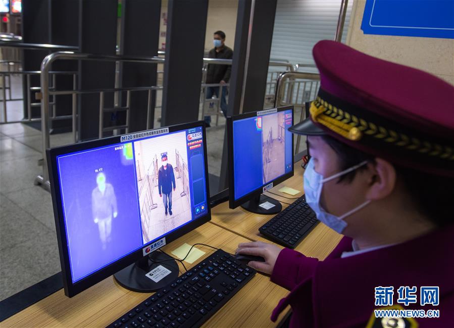 3月23日,在漢口火車站地鐵站,工作人員在測試測溫系統(tǒng)。該車站的2個入口處,已經(jīng)安裝了電子測溫儀器,只要有乘客通過,就會在電腦顯示屏上出現(xiàn)體溫的數(shù)據(jù),監(jiān)控進站乘客體溫。新華社記者肖藝九攝