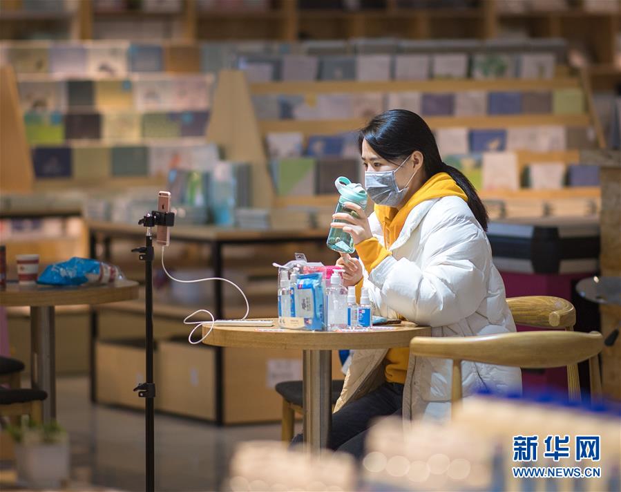 3月29日,在漢口北市場,一名主播在直播平臺直播銷售一款水杯。新華社記者肖藝九攝