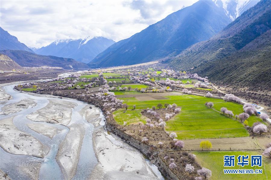 西藏林芝市波密縣境內(nèi)桃花盛開的田園風(fēng)光(無人機(jī)照片,3月26日攝)。新華社記者 普布扎西 攝
