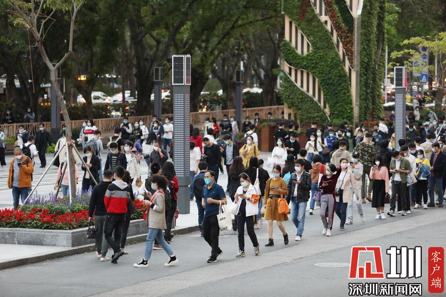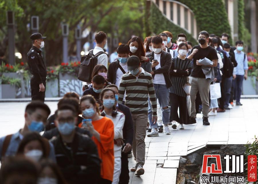見圳客戶端·深圳新聞網(wǎng)2020年3月19日訊 下班時(shí)間,深圳地鐵一號(hào)線深大站A3出口外,下班后的市民在站外排大排長龍,依次有序進(jìn)入地鐵站乘坐列車回家。