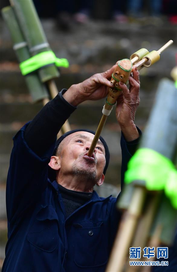 烏英苗寨村民在新蘆笙柱下吹蘆笙(12月22日攝)。新華社記者黃孝邦攝