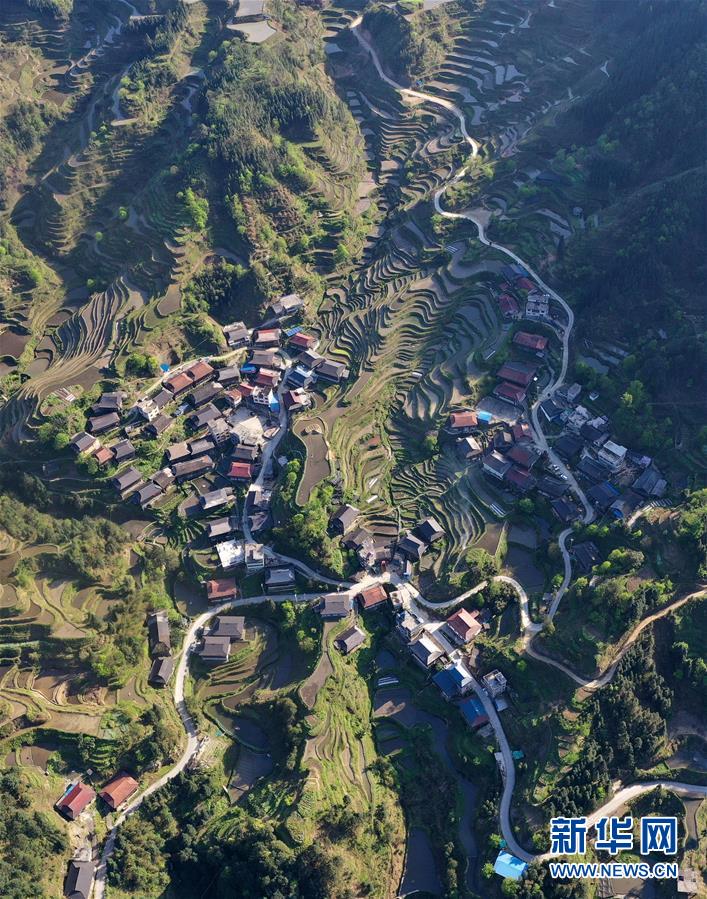 這是融水苗族自治縣桿洞鄉(xiāng)小河村高羽苗寨的木樓和梯田(3月31日攝,無(wú)人機(jī)照片)。新華社記者黃孝邦攝