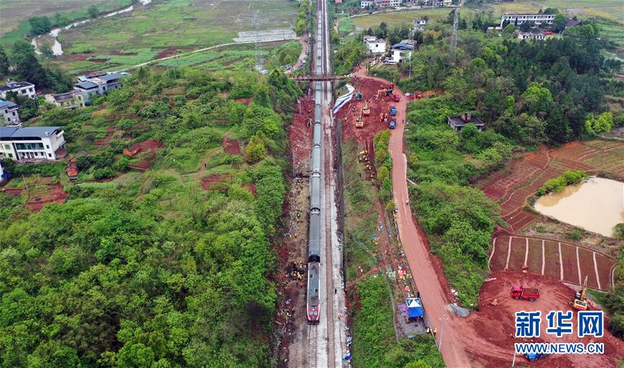 4月1日,Z201次旅客列車通過京廣鐵路郴州段脫軌事故區(qū)段(無人機照片)。新華社記者李尕攝