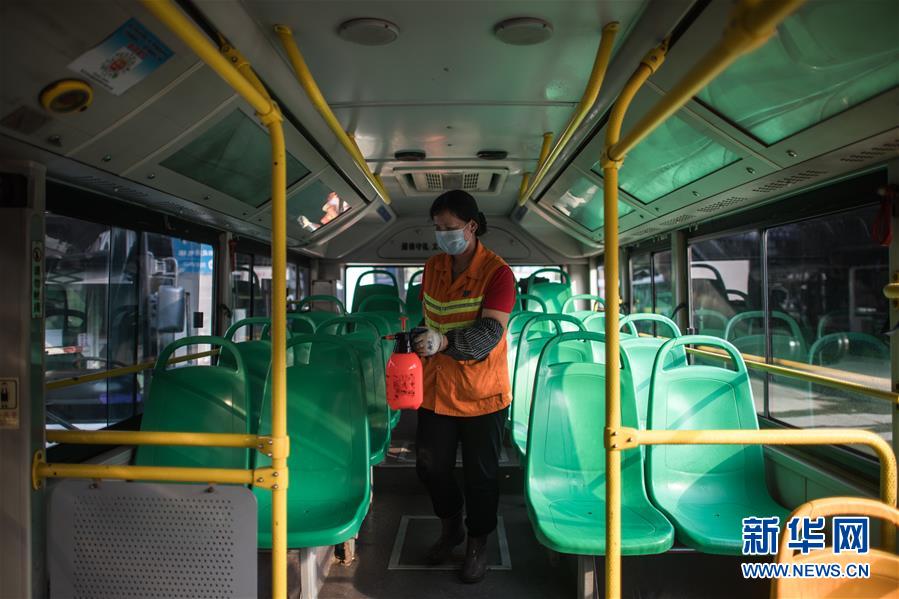 3月23日,在武昌火車站公交車總站,武漢公交集團(tuán)站務(wù)公司保潔員趙真香在為一輛公共汽車消毒清洗。新華社記者肖藝九攝