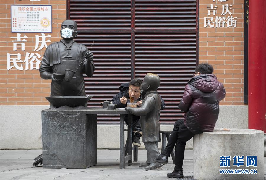 4月1日,市民在吉慶街街頭享用熱干面。新華社記者費(fèi)茂華攝