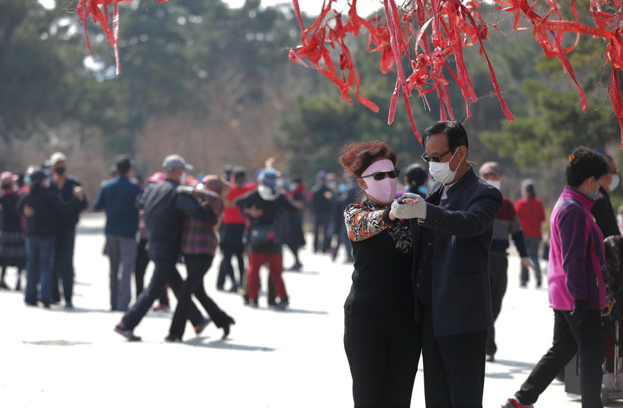 2020年4月6日,遼寧沈陽(yáng),北陵公園在清明小長(zhǎng)假的最后一天,游客猛增。市民對(duì)各項(xiàng)游戲都踴躍參與。圖為伴著歡快優(yōu)美的樂(lè)曲,大爺大媽們紛紛起舞。
