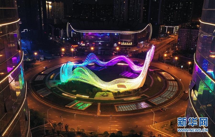 4月7日,武漢光谷環(huán)島開啟燈光秀(無人機照片)。新華社記者李賀攝