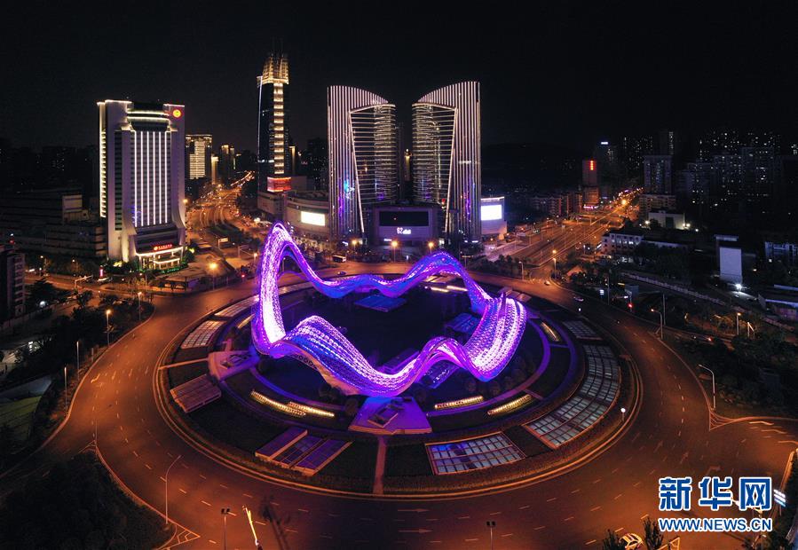 4月7日,武漢光谷環(huán)島開啟燈光秀(無人機照片)。當(dāng)日,隨著武漢解除離漢通道管控進入倒計時,全市開啟了城市景觀照明,夜色中的武漢美不勝收。新華社記者李賀攝