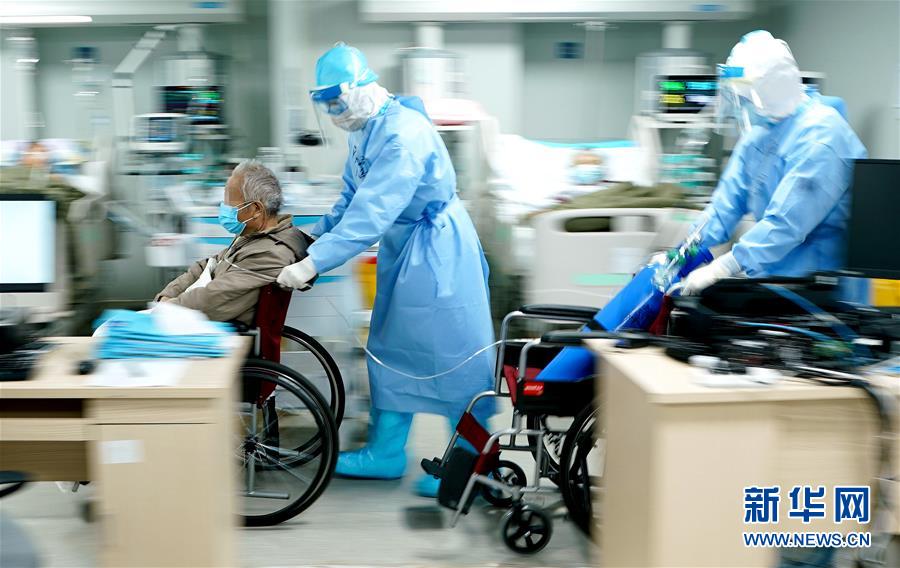 3月20日,武漢火神山醫(yī)院重癥醫(yī)學(xué)一科副主任宋立強(qiáng)(中)護(hù)送81歲的新冠肺炎重癥患者去做CT檢查。為確?;颊哂谐渥愎┭?,醫(yī)生胡世頡推著氧氣瓶隨行。 新華社記者 王毓國 攝