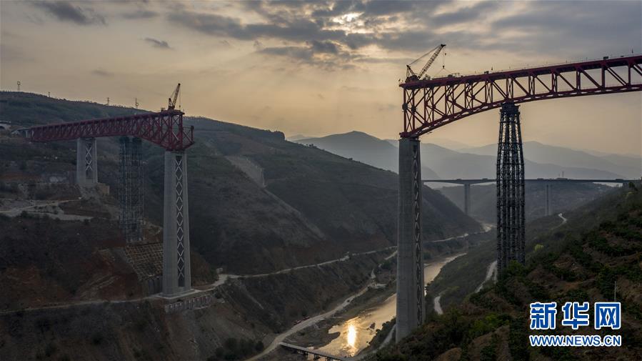 4月8日清晨,工人在中老鐵路元江特大橋上進行鋼桁梁架設作業(yè)(無人機照片)。4月7日,中老鐵路全線重點控制性工程——元江特大橋迎來關鍵節(jié)點,主橋鋼桁梁正式“邁”過154米高的主橋墩,這是世界同類鐵路橋梁第一高墩。元江特大橋位于云南省元江縣,采用上承式連續(xù)鋼桁梁跨越峽谷,全長832.2米,建成后,其249米的主跨也將刷新國內(nèi)同類橋梁跨度紀錄。新華社記者江文耀攝