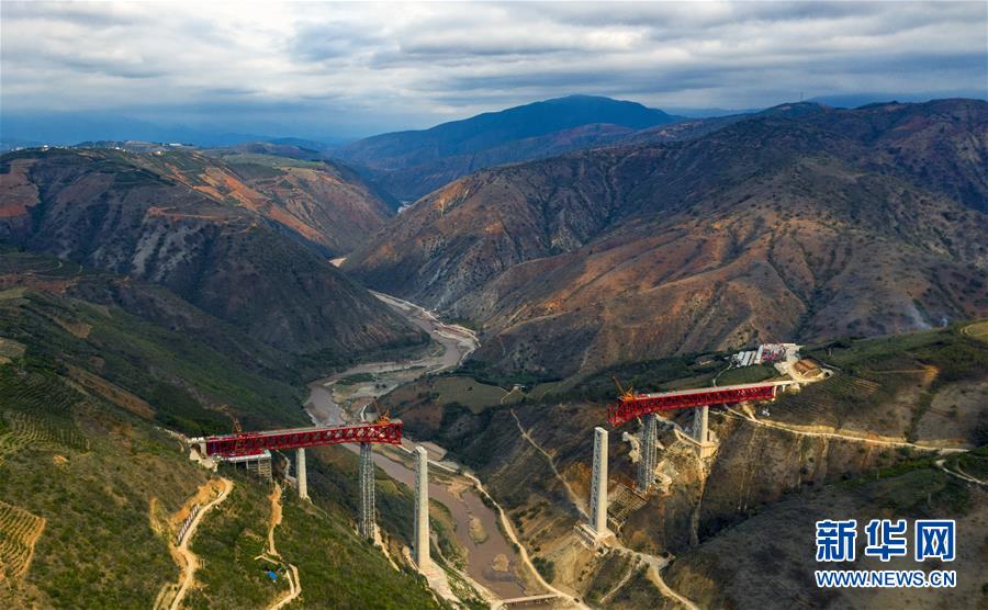 3月5日,空中俯瞰建設中的中老鐵路元江特大橋(無人機照片)。近期,中老鐵路玉溪至磨憨段有序復工復產(chǎn),由中鐵四局承建的中老鐵路全線重點控制性工程——元江特大橋、南溪河特大橋正在加緊施工建設。新華社記者江文耀攝
