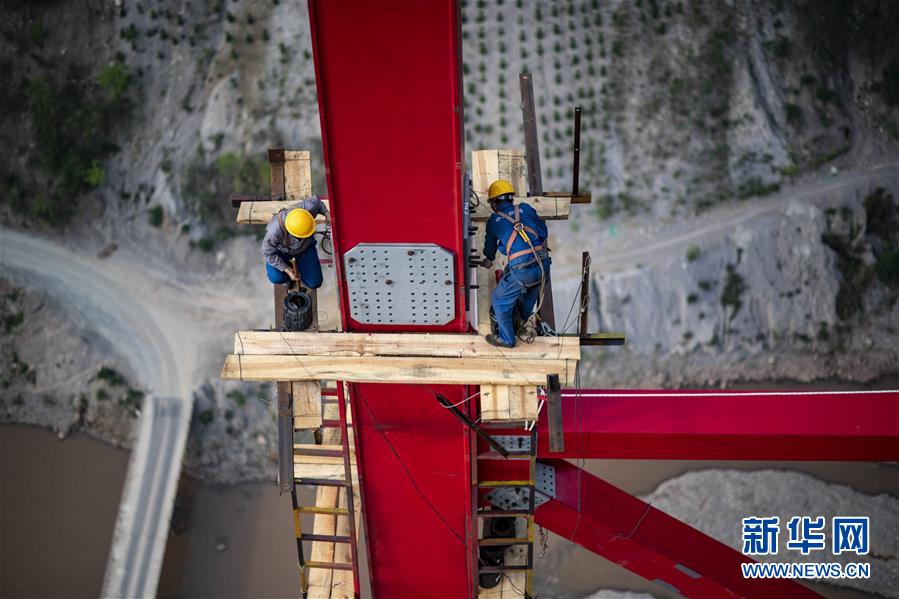 4月8日清晨,工人在中老鐵路元江特大橋上進行鋼桁梁架設作業(yè)(無人機照片)。4月7日,中老鐵路全線重點控制性工程——元江特大橋迎來關(guān)鍵節(jié)點,主橋鋼桁梁正式“邁”過154米高的主橋墩,這是世界同類鐵路橋梁第一高墩。元江特大橋位于云南省元江縣,采用上承式連續(xù)鋼桁梁跨越峽谷,全長832.2米,建成后,其249米的主跨也將刷新國內(nèi)同類橋梁跨度紀錄。新華社記者江文耀攝