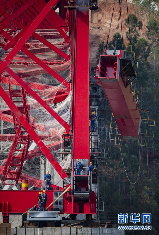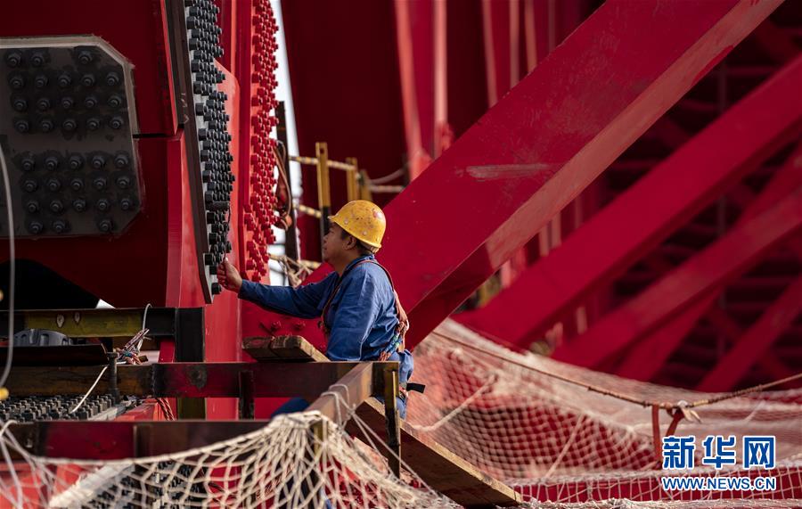 4月8日,中鐵四局的工人們進行鋼桁梁架設作業(yè)。新華社記者江文耀攝
