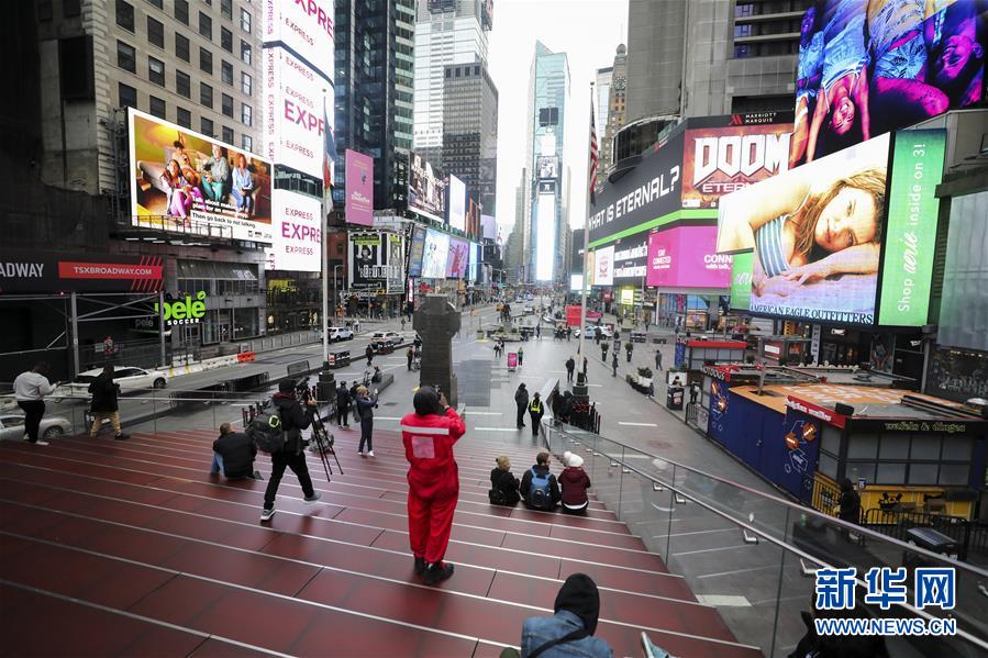 3月19日,人們在冷清的美國紐約曼哈頓時報廣場上參觀。美國約翰斯·霍普金斯大學(xué)發(fā)布的實(shí)時統(tǒng)計(jì)數(shù)據(jù)顯示,截至美國東部時間19日17時30分(北京時間20日5時30分),美國新冠肺炎確診病例累計(jì)13060例,死亡175例。受新冠肺炎疫情影響,紐約等疫情嚴(yán)重的地區(qū)執(zhí)行多項(xiàng)減少人口聚集的措施,昔日的鬧市如今已冷冷清清。新華社記者王迎攝