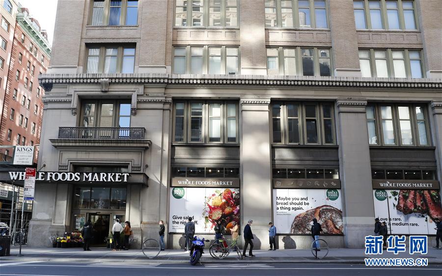 3月21日,在美國紐約,人們排隊(duì)時保持距離,準(zhǔn)備進(jìn)入一家超市購物。新華社記者王迎攝