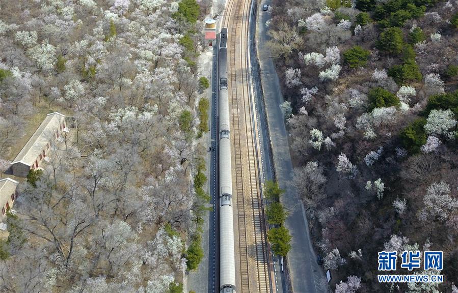 4月8日,北京青龍橋火車站附近春花盛開(無人機照片)。 新華社記者張晨霖攝