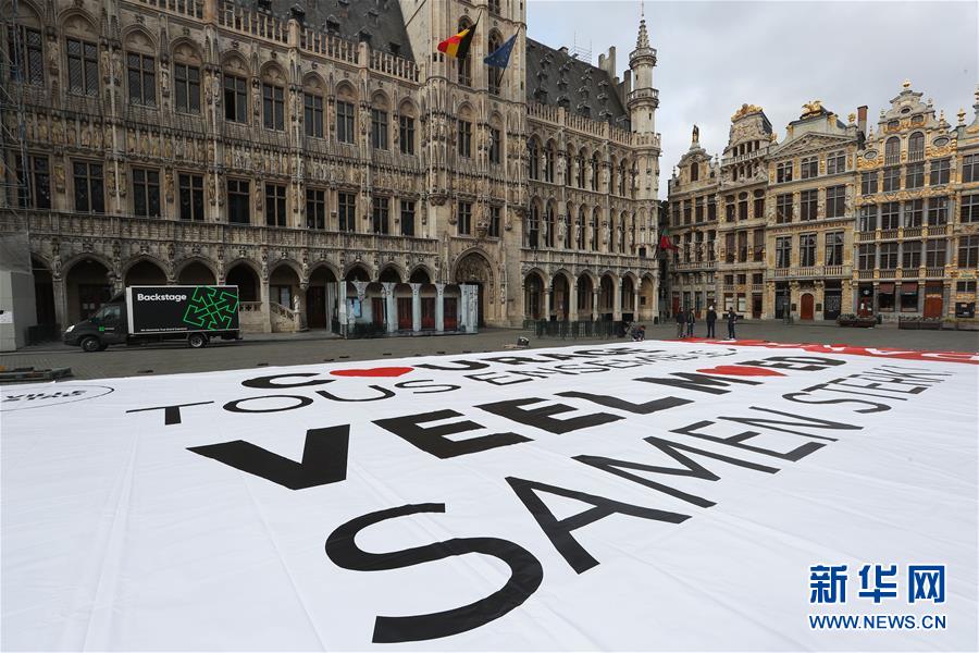 這是4月13日在比利時布魯塞爾大廣場拍攝的為抗擊疫情加油的巨幅海報。當日,比利時布魯塞爾市政府工作人員在市中心的大廣場展開一面巨幅海報,上面用法語和荷蘭語印著“一起鼓起勇氣”“謝謝”,以感謝市民及醫(yī)療人員為抗擊疫情所做的努力。新華社記者鄭煥松攝