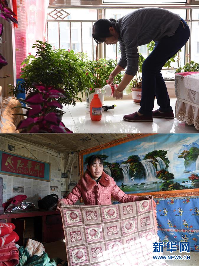 拼版照片:上圖為胥存在古浪縣綠洲生態(tài)移民小城鎮(zhèn)整理家中臥室(4月7日攝);下圖為胥存在古浪縣黃羊川鎮(zhèn)石城村收拾家中床上物品(2018年2月6日攝)。新華社記者范培珅攝