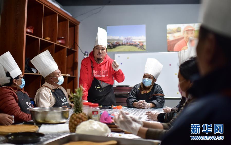 4月2日,才仁俄賽(左三)在玉樹脊髓損傷者“希望之家”做志愿者,為脊髓損傷者講解披薩制作過(guò)程。新華社記者吳剛攝