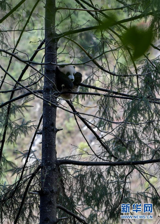 4月14日,大熊貓“喜妹”的幼崽在中國大熊貓保護研究中心核桃坪基地大熊貓戶外活動場的一棵大樹上休息。