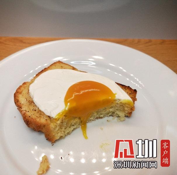 看起來像是土司蛋糕上的荷包蛋。但其實(shí)是烤檸檬海綿蛋糕,香草奶油制作的蛋清以及芒果泥制作的蛋黃。