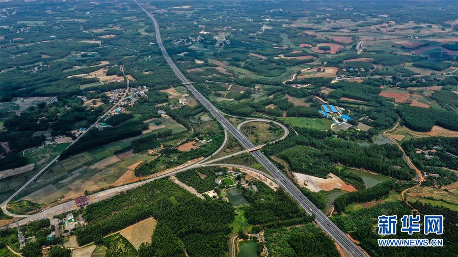 這是4月21日拍攝的合浦縣境內(nèi)的桂海高速公路(無人機照片)。暮春時節(jié),從空中俯瞰廣西北海市合浦縣大地,河流、稻田、蝦塘、道路、村莊星羅棋布、色彩斑斕,美不勝收。新華社記者張愛林攝