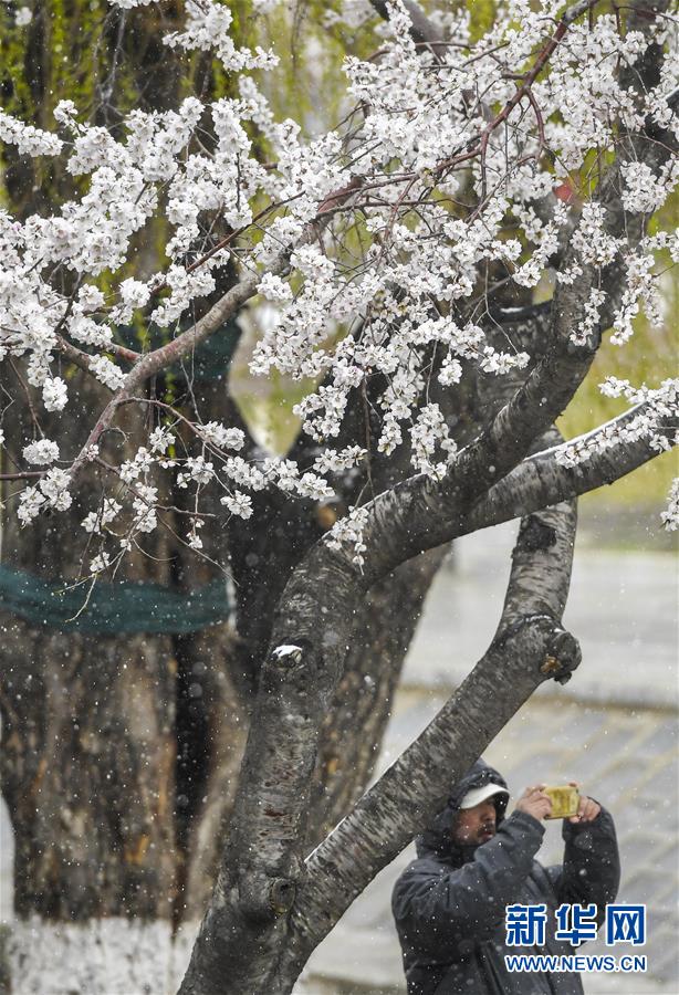 4月21日,市民在長(zhǎng)春市杏花村公園拍攝雪景。當(dāng)日,吉林省多地迎來(lái)降雪天氣。新華社記者許暢攝