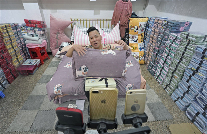 2019年11月11日,浙江金華,義烏北下朱村,在一家床上用品銷售商店,一名男子正在直播。這個(gè)網(wǎng)名叫“點(diǎn)子大哥”的男子姓劉,49歲,來自杭州農(nóng)村,有三年半的直播經(jīng)歷。