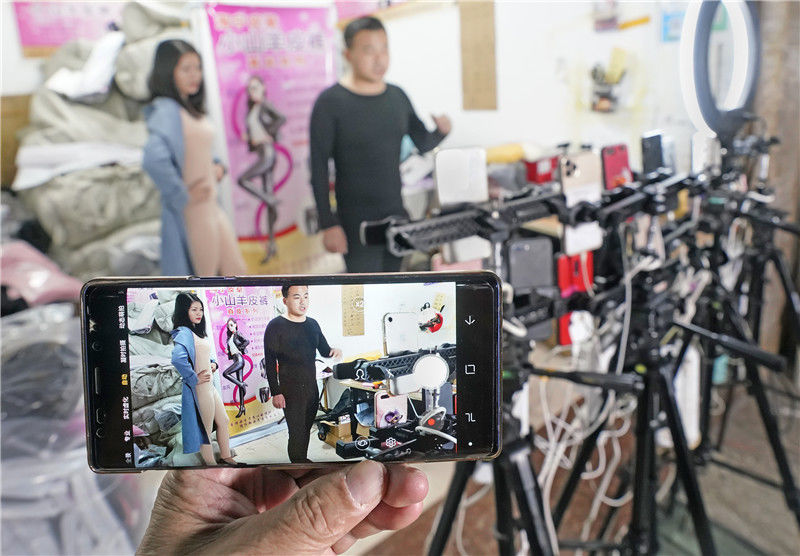 2019年11月9日,浙江金華,義烏北下朱村,倆主播在直播銷(xiāo)售保暖內(nèi)衣。