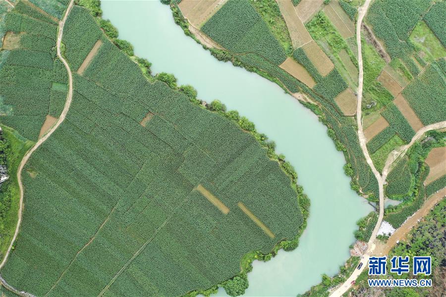 4月23日,在廣西隆安縣南圩鎮(zhèn),農(nóng)人趕著牲畜走過一座小橋(無人機照片)。新華社記者周華攝
