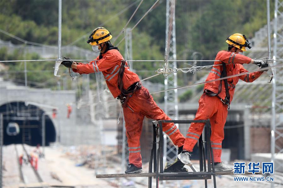 4月25日,在福建省寧德市屏南車站,施工人員開展接觸網(wǎng)調(diào)整作業(yè)。中鐵電氣化局集團上海公司推動衢寧鐵路福建段通信工程、信號工程、電力工程、電氣化工程各環(huán)節(jié)協(xié)同復(fù)工復(fù)產(chǎn),目前來自河北、河南、四川等國內(nèi)10個省的900多名員工返崗就業(yè)。衢寧鐵路北起浙江省衢州市,南至福建省寧德市,全長379.2公里。新華社記者彭張青攝