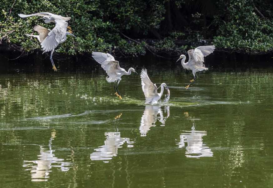4月15日,攝于南山區(qū)華僑城天鵝堡附近。這是深圳拍鷺鳥的其中一個好去處。四只白鷺在水面上爭相捕食。徐捷