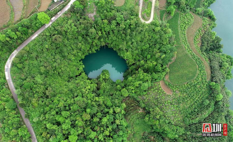 2020年4月24日,在湖南張家界市永定區(qū)“百里畫廊”茅巖河景區(qū)拍攝的“天坑心湖”。(無人機(jī)拍攝)當(dāng)?shù)厝朔Q它“天使之淚”。湖的四周峭壁環(huán)繞,屬于喀斯特地貌。由于地形險(xiǎn)峻,這里很少有人踏足,一直保持著原始生態(tài)面貌。