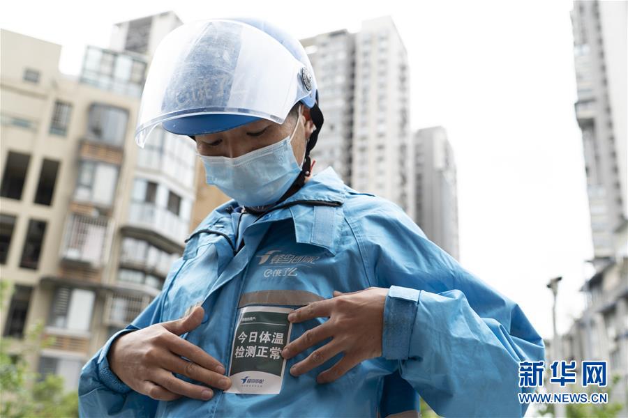 4月22日,在四川省成都市的一家外賣配送站點(diǎn),邱有哈子接受體溫檢測后貼上合格標(biāo)簽。 新華社記者 李夢馨 攝