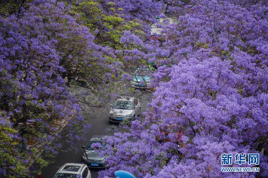 這是5月2日在昆明市桃源街拍攝的藍花楹。近日,云南省昆明市部分街區(qū)的藍花楹競相開放,為春城增添靚麗風景。新華社記者藺以光攝