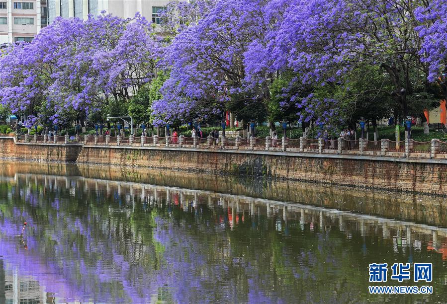 這是5月2日在昆明市桃源街拍攝的藍花楹。近日,云南省昆明市部分街區(qū)的藍花楹競相開放,為春城增添靚麗風景。新華社記者藺以光攝