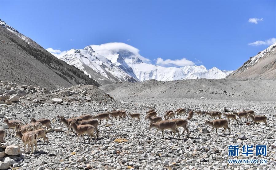 一群巖羊在珠峰大本營附近覓食(5月8日攝)。當日,一群巖羊在珠峰大本營周圍覓食,黃嘴山鴉飛到巖羊身上停留,構(gòu)成一幅幅生動有趣的雪域圖畫。新華社記者普布扎西攝