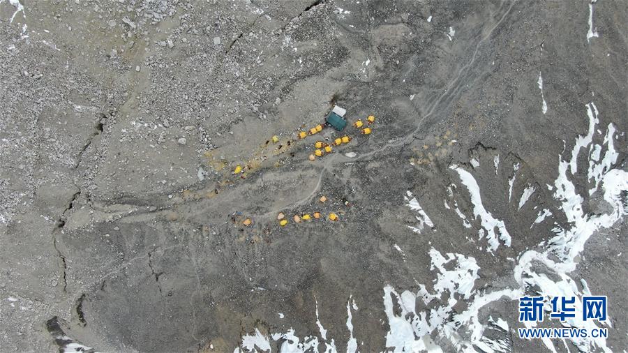這是海拔5800米的過渡營地(5月8日攝,無人機照片)。珠峰過渡營地海拔5800米,是連接前進營地和珠峰大本營的重要一站。登山愛好者從大本營徒步大約四個小時就能抵達過渡營地。此段路程亂石林立,同時也能欣賞壯美的冰川。新華社記者孫非攝
